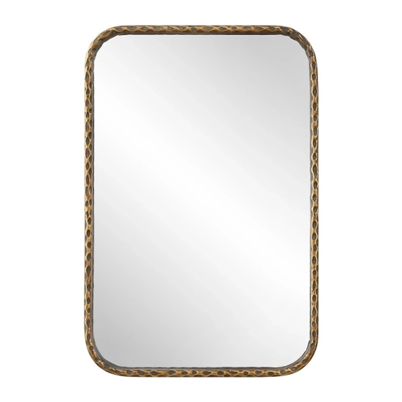 This Aged Bronze Hammered Metal Wall Mirror will instantly open up your space. Its textured frame and sleek design will elevate any wall with a unique beauty! Overall dimensions Width: 30" Depth: 1.75" Height: 20" Crafted of iron and mirror Aged bronze frame finish Rectangular shape Hammered framed texture Weight: 18 lbs. Hangs from back-mounted hardware Care: Dust with a soft, dry cloth. To clean mirror, spray a small amount of glass cleaner onto a lint-free cloth and wipe clean. This item is available at Kirklands.com only, not available in stores. Please note: this item cannot be shipped to APO/FPO addresses.