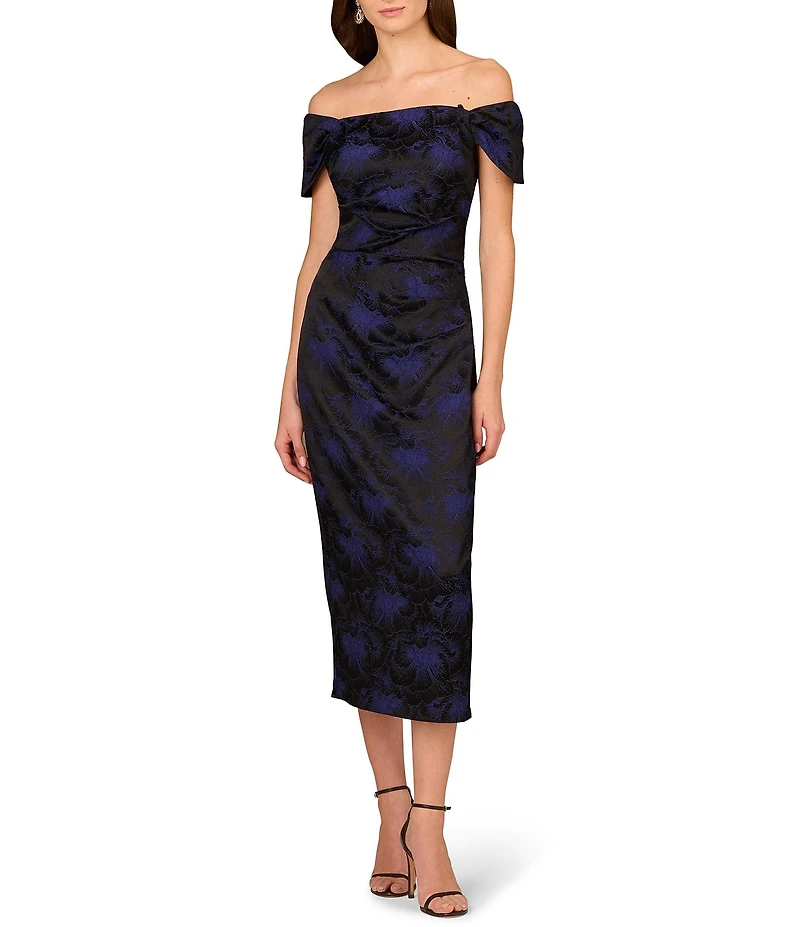 From Aidan Mattox, this dress features: Woven jacquard fabrication Sheath silhouette Off the shoulder neckline Cap sleeves Pleated detail Fully lined Straight hemline Center back zip closure Approx. 50.5" length Viscose/polyester; lining: polyester/elastane Dry clean Imported.