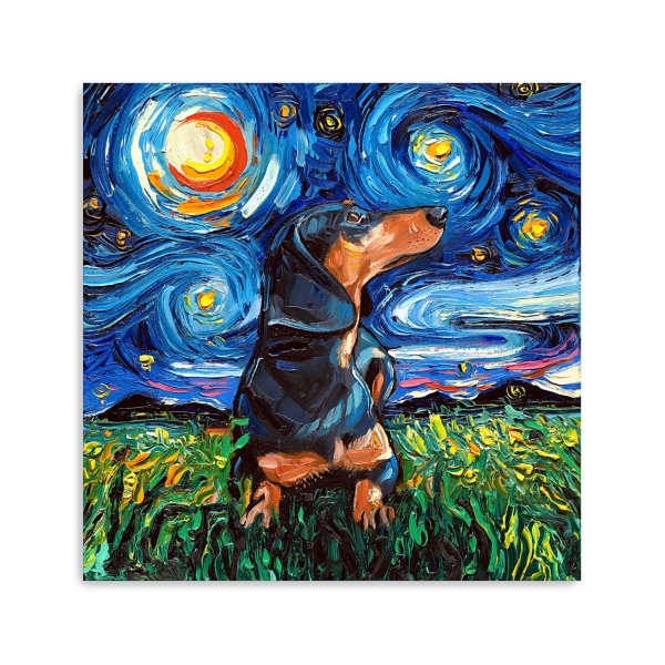 Dog lovers will adore our Aja Trier Dachshund II Starry Night Canvas Print! This art, styled after The Starry Night, gives a unique touch to your décor. Whether you have your own Dachshund or love all dogs equally, you’ll love having this art anywhere in your home! Art measures 20L x 1.25W x 20H in. Printed with Giclee technology on thick polyester archival-grade canvas Stretched and mounted over solid wood Features a black and tan short-haired Dachshund in the style of The Starry Night by Vincent van Gogh as subject Hues of blue, green, yellow, orange, red, brown, white, and black Weight: 3.61 lbs. Artist: Aja Trier Hangs from back-mounted hardware Made in the United States Care: Dust with a soft, dry cloth. Keep away from direct sunlight, heat, and moisture. This item is available at Kirklands.com only, not available in stores.