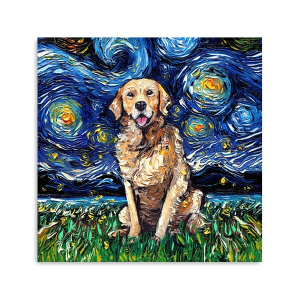 Dog lovers will adore Aja Trier's Golden Starry Night Canvas Art Print! This print is styled after the iconic Van Gogh painting, The Starry Night, with a personalized twist. It's perfect for your own home or as a gift! Art measures 20L x 1.25W x 20H in. Printed with Giclee technology on thick polyester archival-grade canvas Stretched and mounted over solid wood Features a golden retriever dog in the style of The Starry Night by Vincent van Gogh Hues of blue, green, yellow, orange, tan, and black Weight: 3.61 lbs. Artist: Aja Trier Hangs from back-mounted hardware Made in the United States Care: Dust with a soft, dry cloth. Keep away from direct sunlight, heat, and moisture. This item is available at Kirklands.com only, not available in stores. Please note: this item cannot be shipped to APO/FPO addresses.