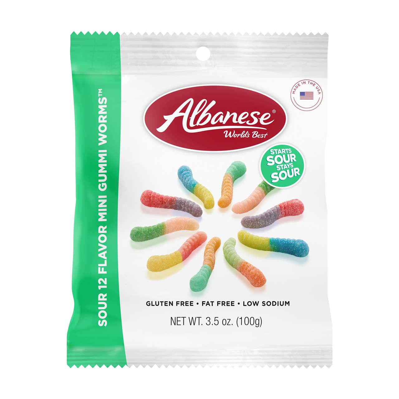 - 3.5oz bag of Albanese 12 Flavor Sour Mini Gummi Worms