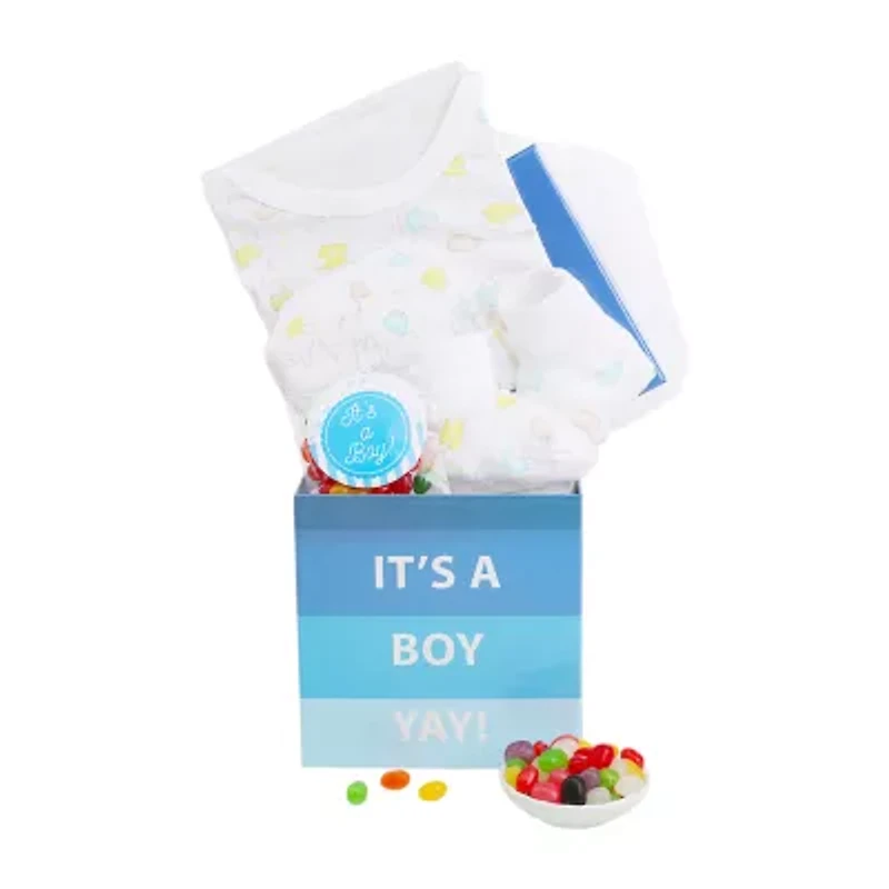 Perfect to surprise the new parents and baby boy as they bring home the newest member of their family. This adorable gift is packed with everything needed to welcome a new bundle of joy to the world. 3 Piece Baby Gift Set (Booties, Cap, and One Piece), Baby Box, Jelly Beans (1oz.).