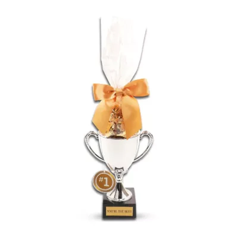 Contains 2 items: 1pc Silver Plastic Trophy, 1pack of Foil Wrapped Hard Candies (6oz)