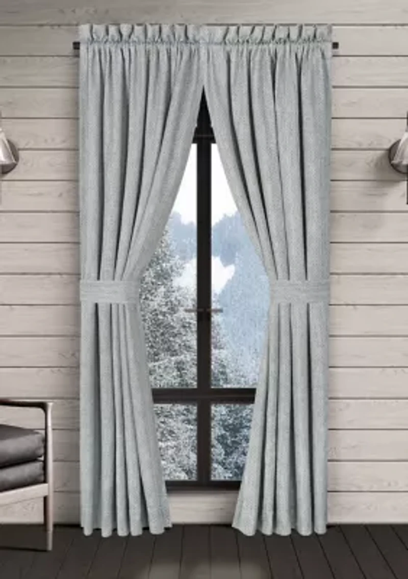 These J. Queen New York window panels feature a soft spa blue and cream colored woven textured design, creating a sleek yet cozy design. Constructed with a 3" rod pocket, weighted hem, tie-backs and a lined reverse to offer room-darkening comfort. Pair these panels with the Alejandro window valance and bed set for a complete look (sold separately). 50" x 84" lined panels 50" x 95" lined panels 3" rod pocket with 3" header 4 piece set Plaid pattern Imported Material & Care Polyester Dry clean only