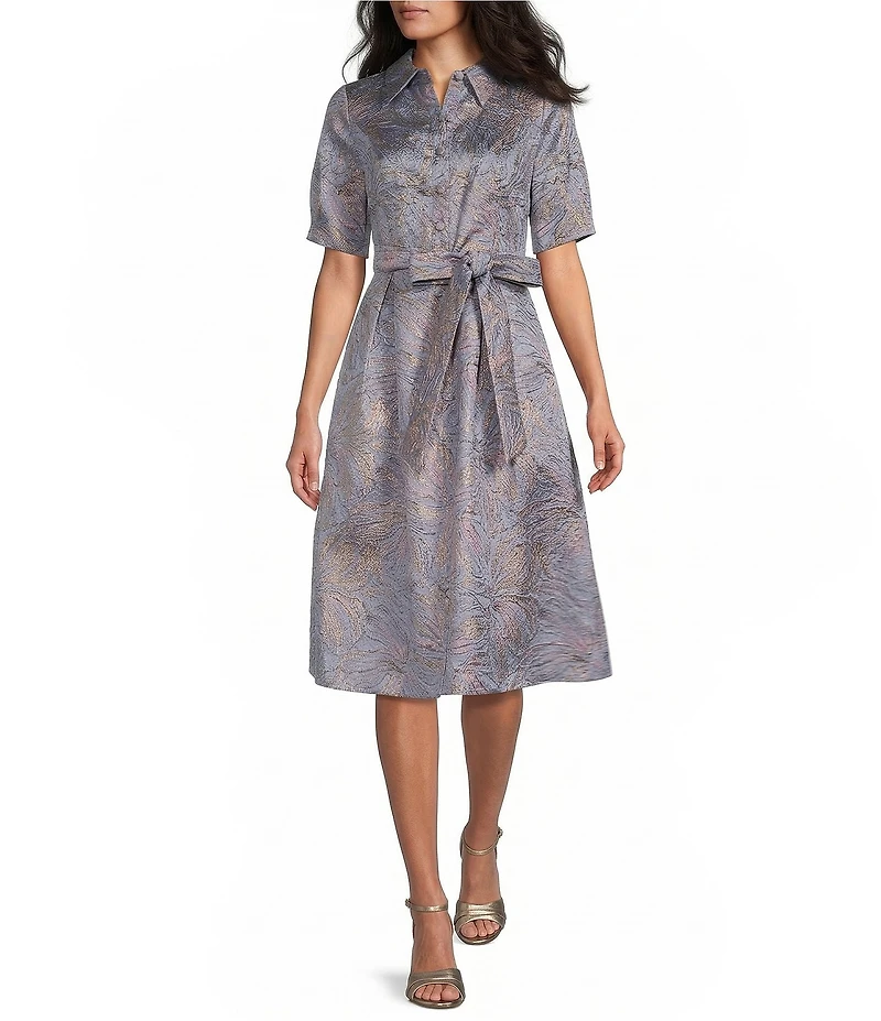 From Alex Evenings, this dress features: Printed Jacquard fabrication  Collar neckline Short bubble hem sleeves Lined Tie waist detail Center front button bodice closure Approx. 44.5" in length Polyester Hand wash Imported