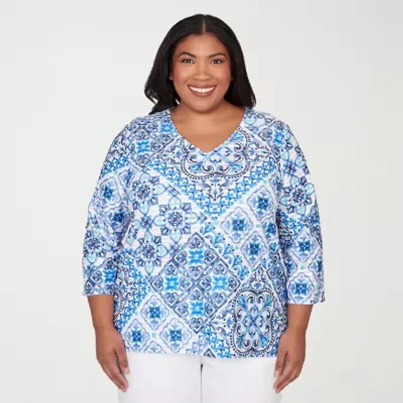 Alfred Dunner Mykonos Womens Plus V Neck 3/4 Sleeve T-Shirt