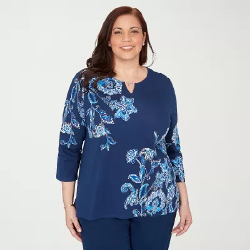 Alfred Dunner Mykonos Womens Split Crew Neck 3/4 Sleeve T-Shirt