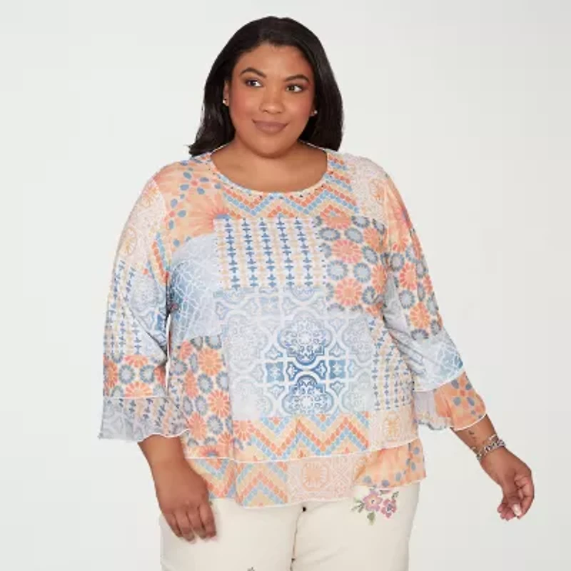 Alfred Dunner Womens Plus Crew Neck 3/4 Sleeve T-Shirt