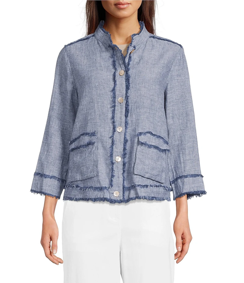 From Ali Miles, this jacket features: Yarn-dyed woven fabrication Stand collar 3/4 cuffed sleeves Frayed edge detail Two front functional patch pockets Button front closure Approx. 24" length Linen/cotton Machine wash cold/tumble dry low Imported.