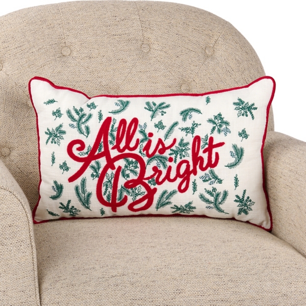 Fill your home with Christmas cheer with this All Is Bright Pine Lumbar Pillow. It will bring a cute and cozy charm to your home this holiday season! Pillow measures 20L x 12H in. Crafted of polyester Features the phrase "All is bright" Pine accents Hues of white, red, and green Solid white reverse Care: Spot clean only. Contact your local Kirkland's store for availability. Quantities and selection may vary by location.