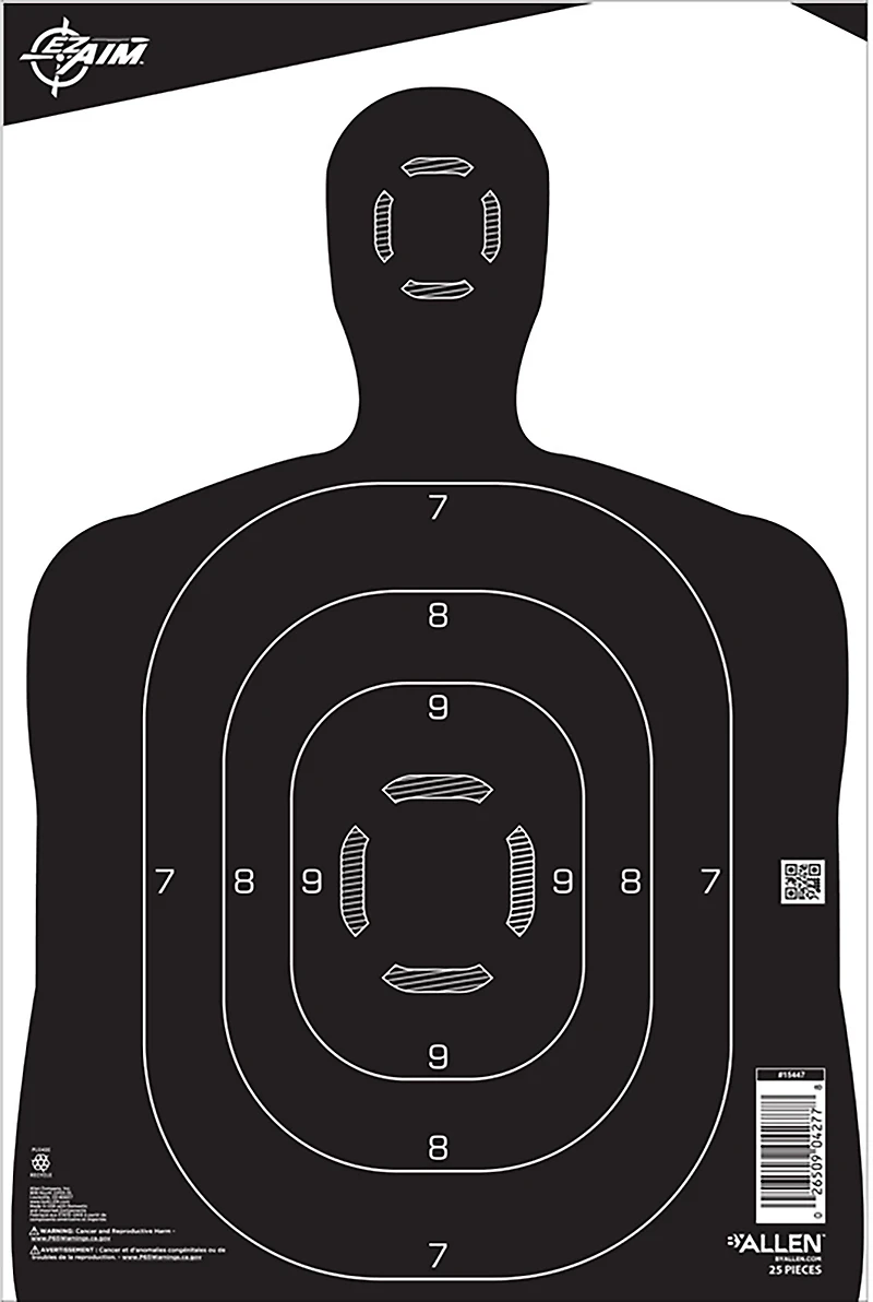 Practice your aim with ease using the Allen Company EZ Aim 12 in W x 18 in H Silhouette Paper Shooting Targets 25-Pack. Featuring 25 targets per pack, these targets come with a center of mass aiming point for easy identification.