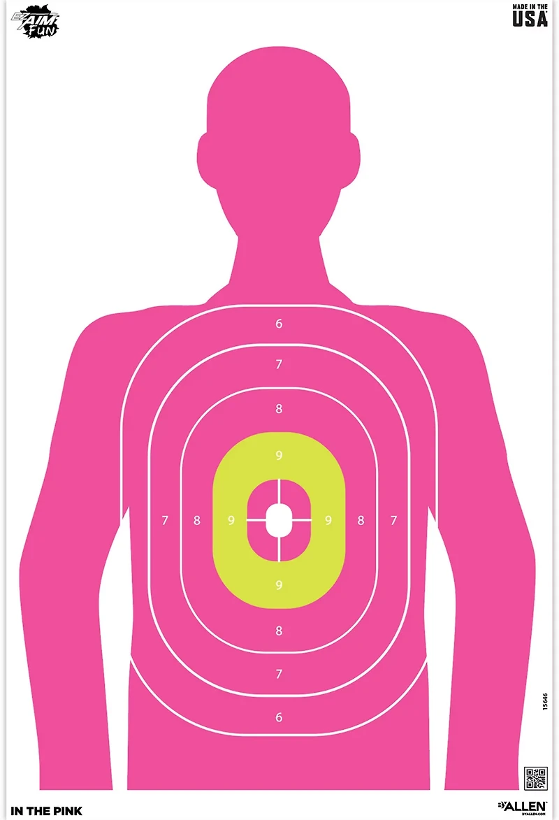 Set up the Allen Company EZ Aim Fun In The Pink Silhouette Paper Shooting Targets 8-Pack in your indoor or outdoor space and practice your shooting. The targets offer a bright silhouette of a person with a center-of-mass design to help you see how accurate your aim is.