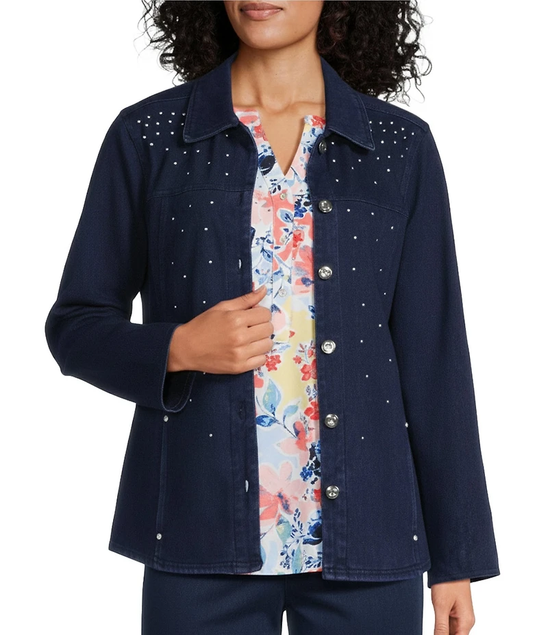 From Allison Daley, this jacket features: Denim knit fabrication Point collar neckline Long sleeves Button front closure Embellished detail On-seam pockets Approx. 26.5" length Polyester/cotton/spandex Machine wash/tumble dry Imported.