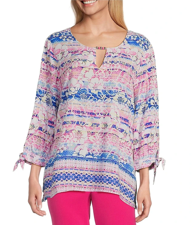 Allison Daley Flower Swirl 3/4 Tie Sleeve Keyhole Neck Knit Top