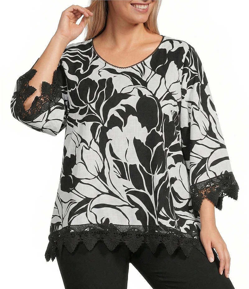 From Allison Daley Plus, this blouse features: Black/white tulip print V-neckline 3/4 sleeves Pullover construction Lace trim detail Rayon Machine wash/ tumble dry Imported.