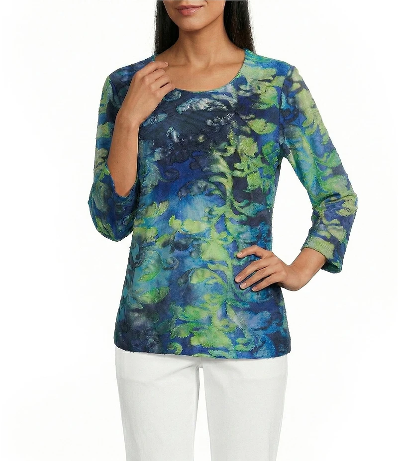 From Allison Daley, this top features: Tie-dye jacquard knit fabrication Crew neckline 3/4 sleeves Pullover construction Polyester/rayon/spandex Machine wash/tumble dry Imported.
