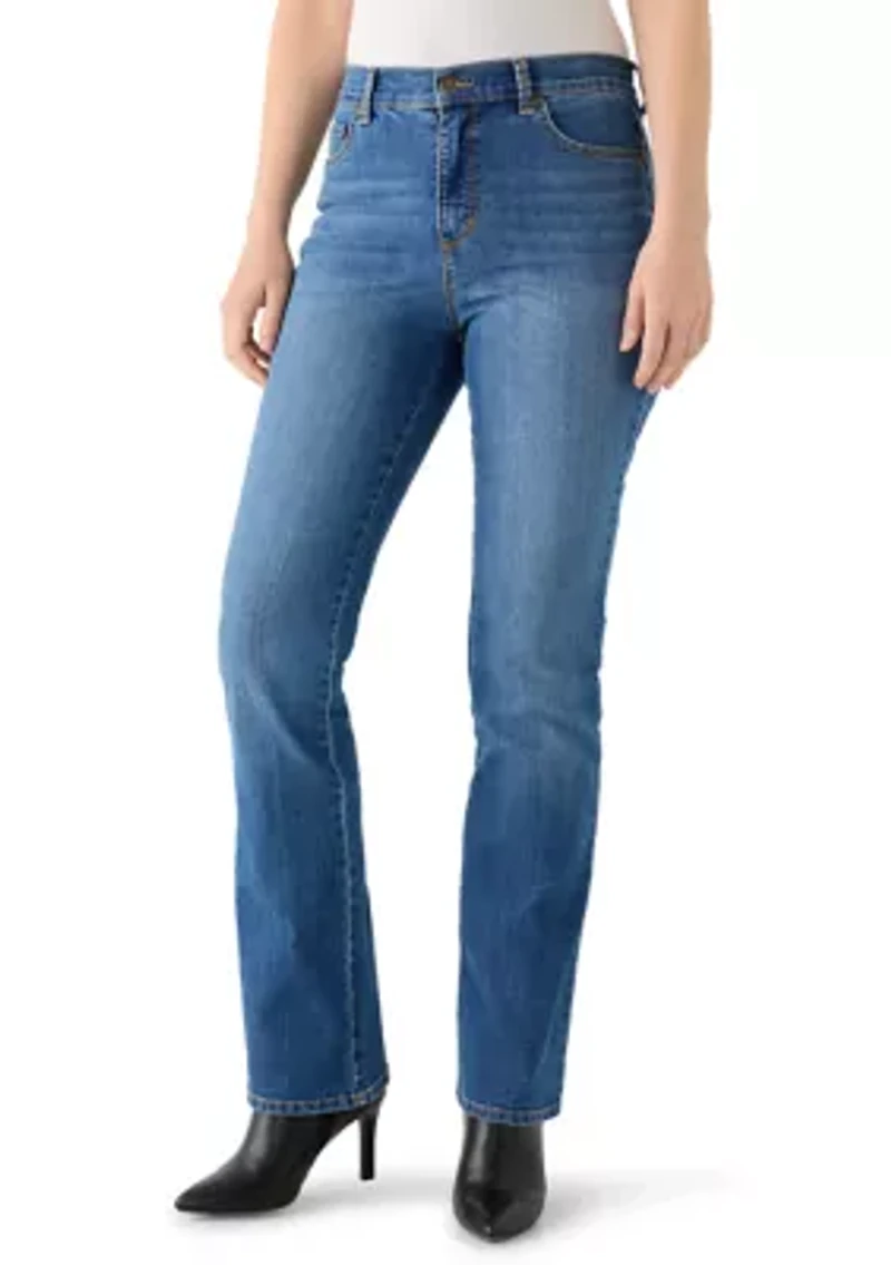 Experience ultimate comfort and style with these classic-fit jeans from Gloria Vanderbilt. Featuring a flattering high-rise waist and a timeless bootcut leg, these jeans offer a comfortable and versatile fit. Crafted from a soft and durable blend of cotton, they provide all-day comfort and a touch of stretch. With convenient pockets and both button and zip closures, these jeans are perfect for any occasion. Button closure, zip closure Belt loops Classic 5-pocket styling Classic fit Bootcut leg Imported Product Specifications 32" Inseam Material & Care 68% Cotton, 30% Polyester, 2% Spandex Machine washable