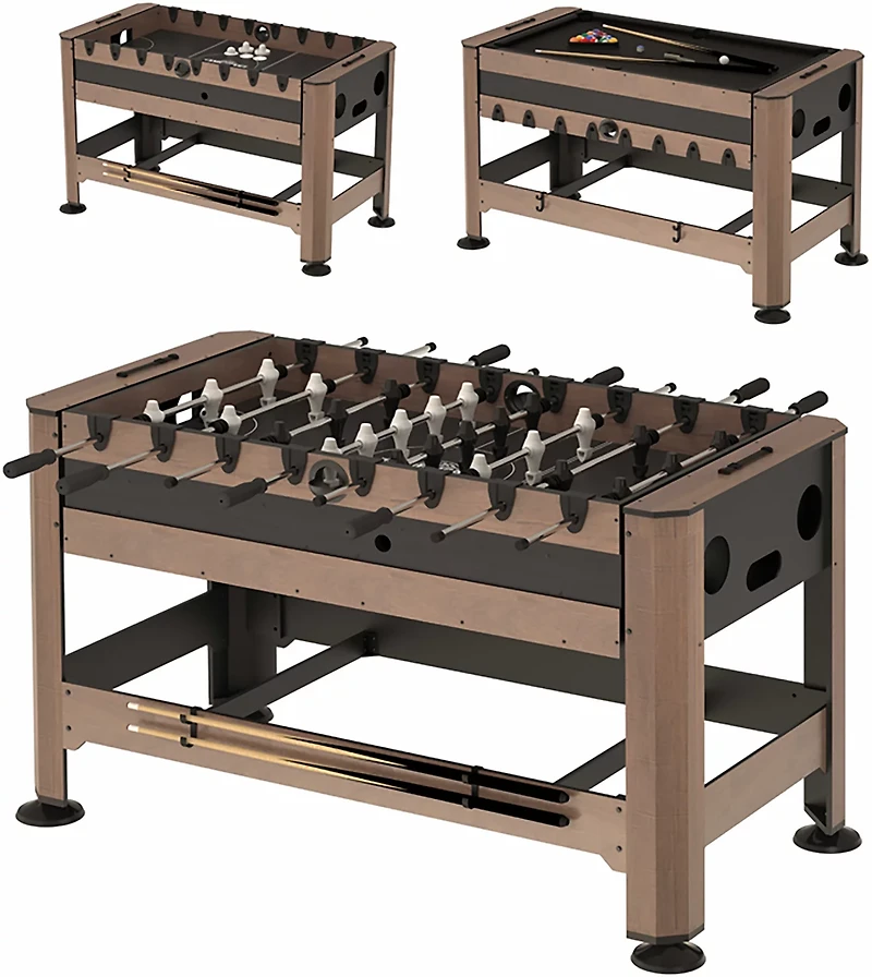 Bring home triple the excitement with the Windsor 56" Swivel Table, featuring three classic games in one sleek, space-saving design—billiards, air hockey, and foosball. The smooth swivel mechanism makes switching games effortless, while built-in storage keeps accessories organized. Its quick-connect foosball rods ensure fast setup, and the rustic smoked oak finish adds a refined touch to any room. With all necessary equipment included, it’s everything you need for endless game nights, all in one package.