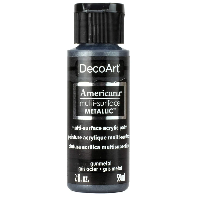 Americana Multi-Surface Metallic acrylic paint is perfect for enhance elegant décor projects. It can be used to paint glass containers, plastic lamp shades, wooden photo frames, canvas shoes, terra cotta pots and more. This permanent, self-sealing acrylic paint has excellent adhesion to most surfaces, and it dries to a durable hard finish that is dishwasher safe and highly resistant to cleaning chemicals once fully cured.Details: Available in multiple colors 2 fl. oz. (59 ml) Metallic finish Water based and rust resistant Permanent, self-sealing and lightfast Nontoxic and moisture resistant Compatible with wood, ceramics, glass, metal, paper mache, fabric, terra cotta, canvas and most plastics For indoor and outdoor use