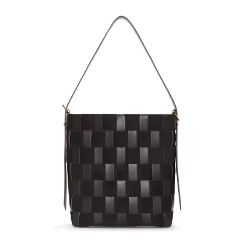 Intricately designed and versatile, the Cynthia women's bucket bag from a.n.a is a trendy everyday carryall. It's made from faux leather and suede woven in a checkerboard pattern, and features a lined interior with zip and slip pockets, a magnetic button closure, and a shoulder strap for an adjustable length.