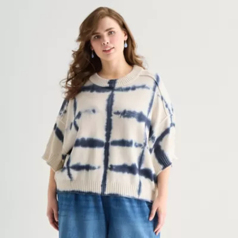 a.n.a Plus Womens Crew Neck Short Sleeve Tie Dye Pullover Sweater