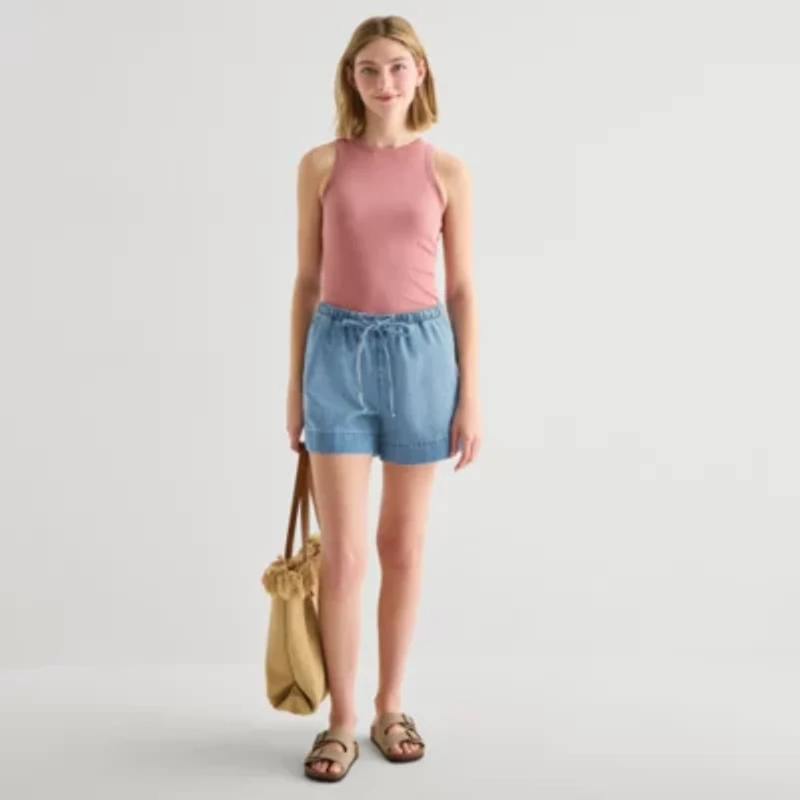 You'll love the chic paperbag shape of these a.n.a women's denim shorts for summer styling. Made from a recycled cotton blend, this mid-rise pair has an elastic-drawstring waistband, a boxy-fit and subtle ruffled hems for a feminine finish. Wear them with a camisole or tank top and slides.