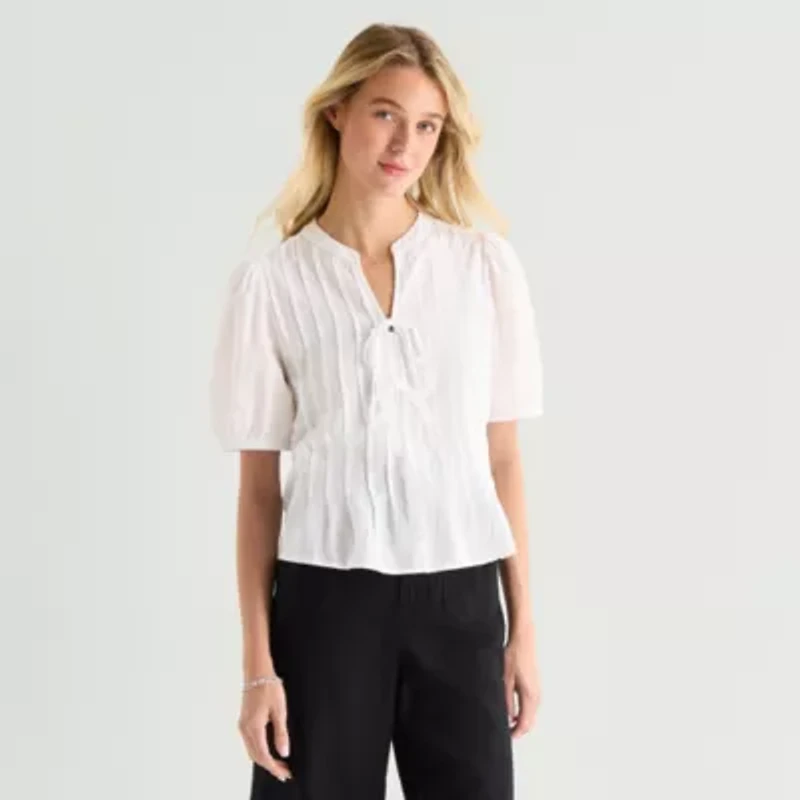 This a.n.a women's y-neck blouse is a crisp boho style for your warm-weather wardrobe. Made from 100% cotton, this top has bows, pintucked details and short puffed sleeves. Wear it with pants or jeans.