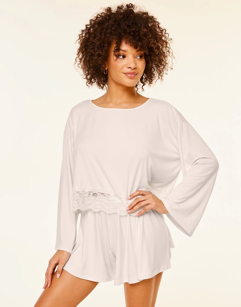 This super soft and cozy PJ set will make getting out of bed a breeze! The Ande Light White set includes a knit PJ set with a flared shorts made from 95% recycled polyester, making it a sustainable wardrobe staple. (Available in sizes XS-4X).