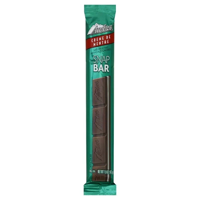 Traditional Andes three layer Andes Crème de Menthe. Easy to snap off and share or consume yourself! The same smooth blend of mint and chocolate flavors for the perfect on the go treat.Details:1.5 oz.6" x 1" x .25" candy sizeEvenly proportioned into 4 segmentsContains milk and soy