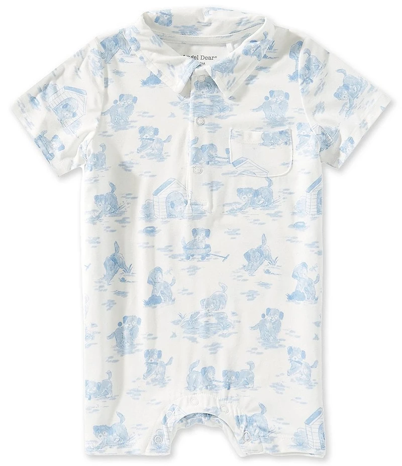 From Angel Dear, this shortall features: Allover puppy toile blue print Polo collar Short sleeves 3-button placket Snap leg closure Approx. 3-5 inches Viscose from bamboo/spandex Machine wash/tumble dry Imported.