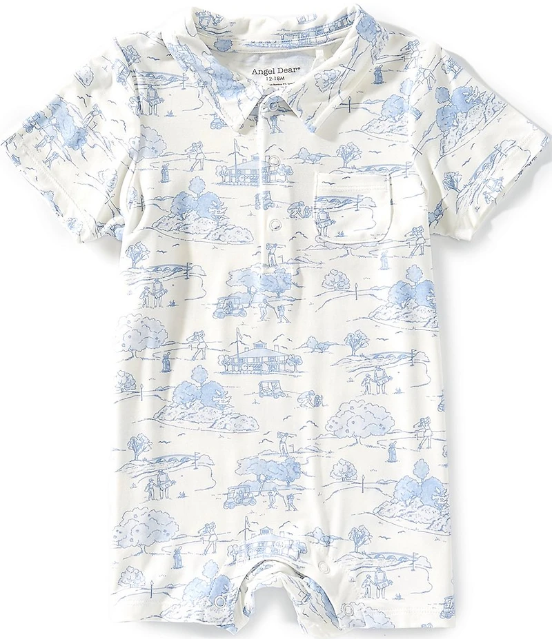 From Angel Dear, this romper features: Allover toile print Polo collar Short sleeves 3-button placket Short (3-5 inches) Snap leg closure Viscose from bamboo/ spandex Machine wash/tumble dry Imported.