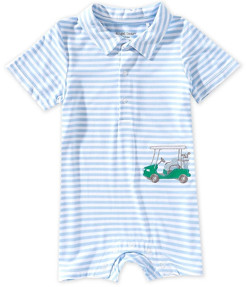From Angel Dear, this romper features: Stripe fabrication Polo collar Short sleeves 3-button placket Golf cart applique Short (3-5 inches) Snap-button closure between legs Viscose from bamboo/spandex Machine wash/tumble dry Imported.