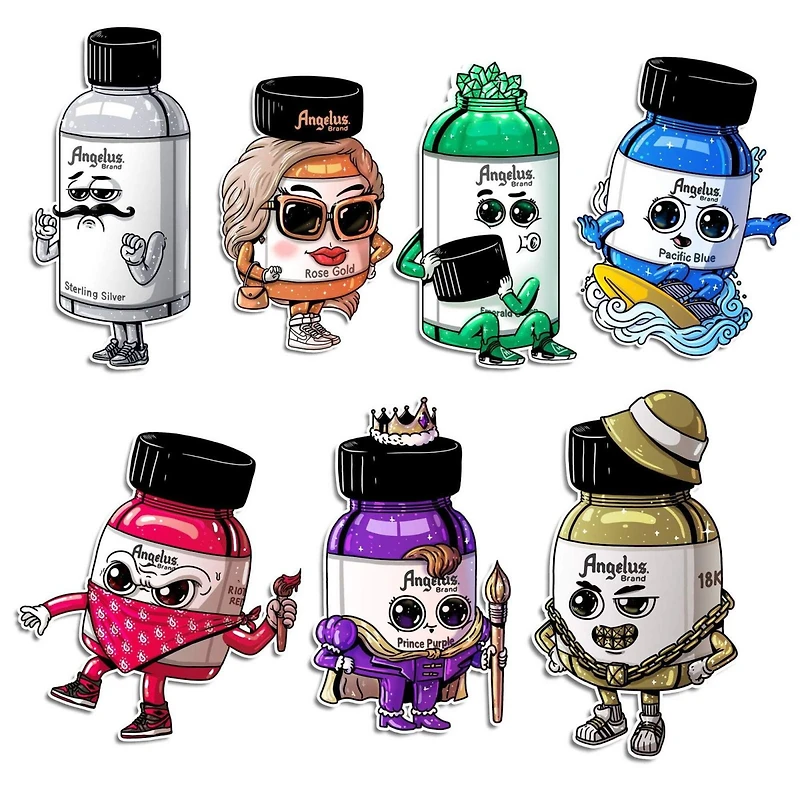 Vinyl sticker pack featuring artwork by @AlexMDC. This sticker pack includes 5 stickers showcasing 5 different hand-drawn Angelus Products in the artist's signature style.