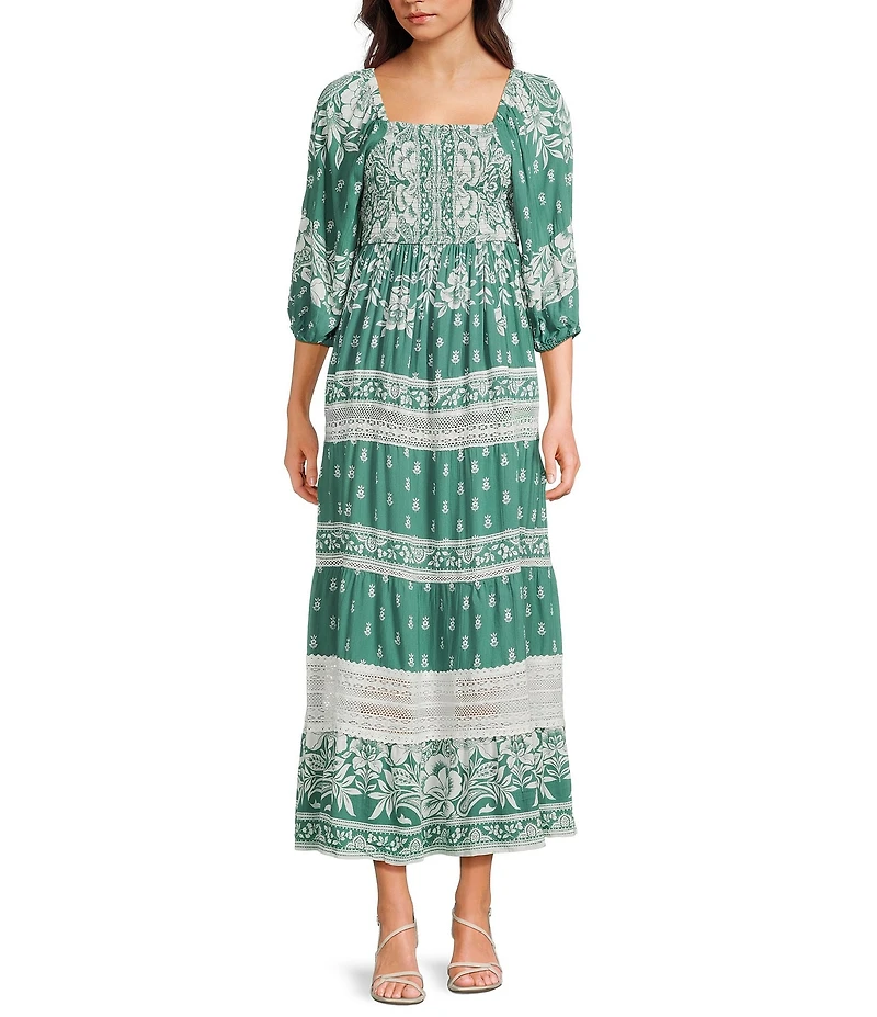 Angie Border Printed Square Neck 3/4 Sleeve Smock Bodice Crochet Trim Midi Dress in Chattanooga, TN