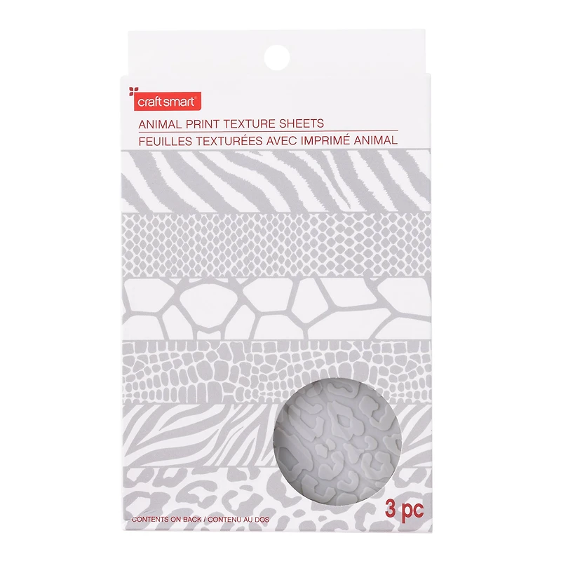 These clay texture sheets from Craft Smart are the perfect tools for your clay crafting kit. Use them to make animal print designs that can easily be used to make earrings, necklaces, or simply use them to add dimension to your sculpting projects.Details:Animal print designs3.74" x 5.75" (9.4cm x 14.6cm) sheet size3 double-sided texture sheets (6 total designs)Clay sold separatelyClean with soap and waterPlastic