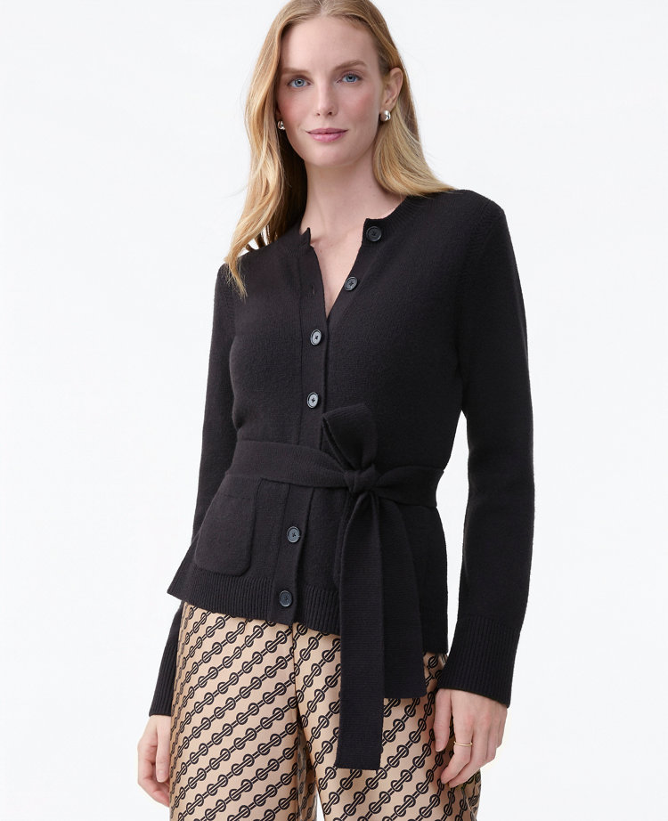 Chic and streamlined, this belted cardigan works well on its own or styled over a simple tank. Ribbed crew neck, cuffs and hem. Long sleeves Front button closures. Patch pockets Functional waist tie, Imported:, Fit: Softly fitted, Length: 23 1/2"long, Fabrication: 54% Acrylic, 30% Polyester, 16% Nylon, Garment Care: Machine Washable Belted Crew Neck Cardigan by Ann Taylor Size Classic - XS Black Women's Crew, Neck Long Sleeve Cardigan Sweaters 54% Acrylic 30% Polyester 16% Nylon Machine Washable