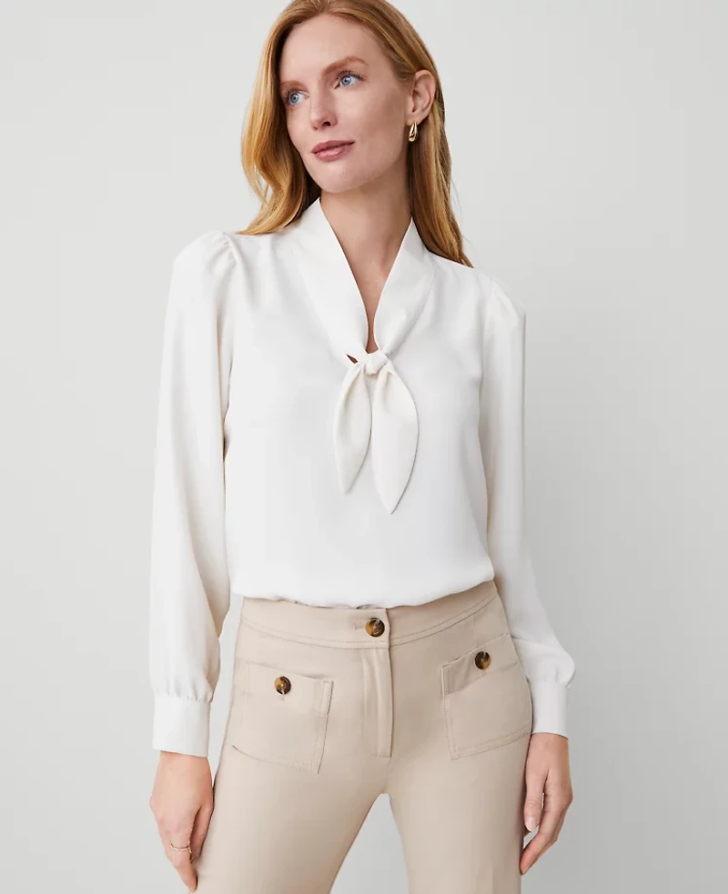 With a bow at its neckline, this fluid blouse ties ensembles together with polished chic. Scoop neck with ties. Long blouson sleeves with puff shoulders and button cuffs., Imported:, Fit: Blousy our most relaxed fit, Length: 24 1/2 long, Fabrication: 100% Polyester, Garment Care: Machine Washable Bow Blouse by Ann Taylor Size Classic - Small Winter White Women's V - Neck, Long Sleeve Blouse Tops 100% Polyester Machine Washable