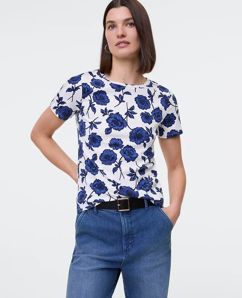 Soft, understated yet relaxed this tee is one we want in every pattern and hue. Round neck Short sleeves, Imported:, Length: 25"long, Fabrication: 100% Cotton, Garment Care: Machine Washable Floral Crew Neck Tee by Ann Taylor Size Classic - 2XS Electric Periwinkle Women's 100%, Cotton Crew Neck Short Sleeve Tees Tops 100% Cotton Machine Washable