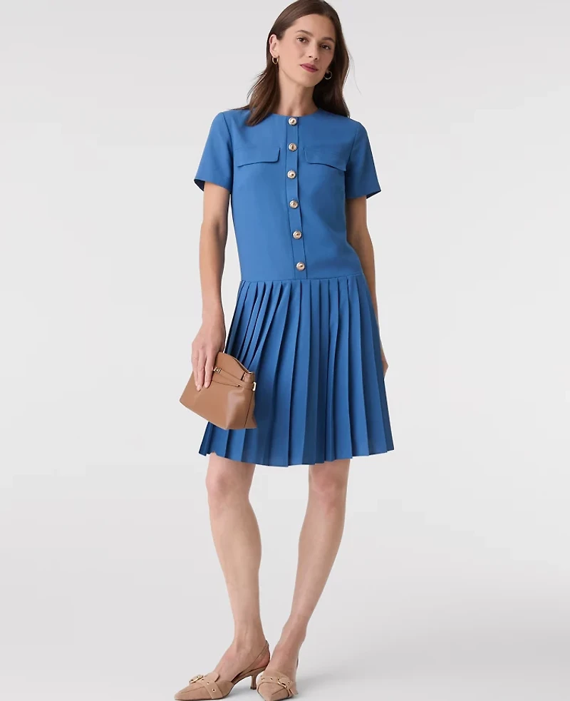 A smart pleated skirt brings an extra dose of texure to this chic shift dress. Crew neck Front button placket. Short sleeves Hidden back zip closure. Lined body, Hit: Hits above the knee, Imported:, Length: 19"from natural waist, Fabrication: 100% Cotton, Garment Care: Machine Washable Pleated Shift Dress by Ann Taylor Size Classic - 0 Refreshingly Blue Women's Shift, 100% Cotton Regular Crew Neck Short Sleeve Dresses 100% Cotton Machine Washable