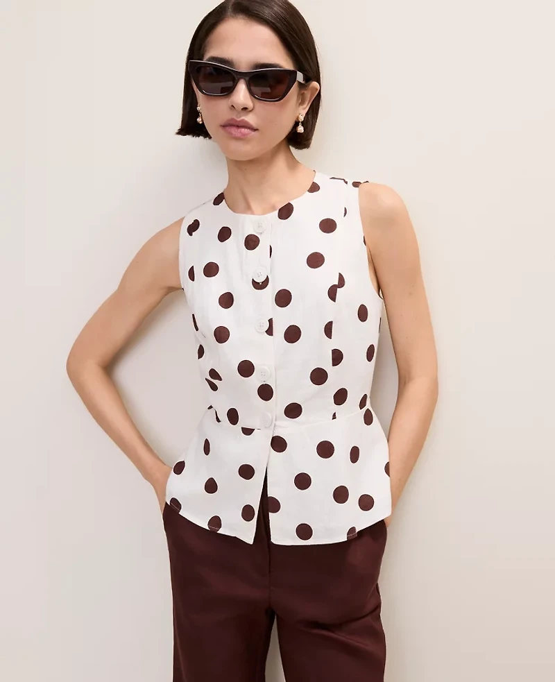 Playful polka dots enrich the chic appeal of this must - have peplum top. Crew neck Sleeveless Front button closures. Lined, Imported:, Fit: Waist - defining: feminine and flattering, Length: 21 3/4"long, Fabrication: shell 55% linen 45 viscose, lining 100% cotton, Garment Care: Machine Washable Polka Dot Linen Blend Peplum Tank Top by Ann Taylor Size Classic - 0 White Women's Scoop, Neck Sleeveless Tanks Shells Tops shell 55% linen 45% viscose lining 100% cotton Machine Washable