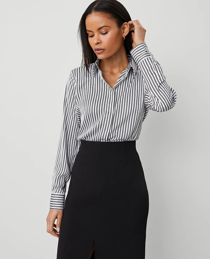 A minimalist staple tailored with clean lines, this flattering shirt promises a flawless silhouette. Point collar Hidden front button placket. Long sleeves with button cuffs. Shirttail hem, Imported:, Fit: Classic an easy, straight fit Length: 26 1/2 long, Fabrication: 100% Polyester, Garment Care: Machine Washable Striped Slim Fit Shirt by Ann Taylor Size Classic - Small Black Women's Split, Neck Long Sleeve Shirts Tops 100% Polyester Machine Washable