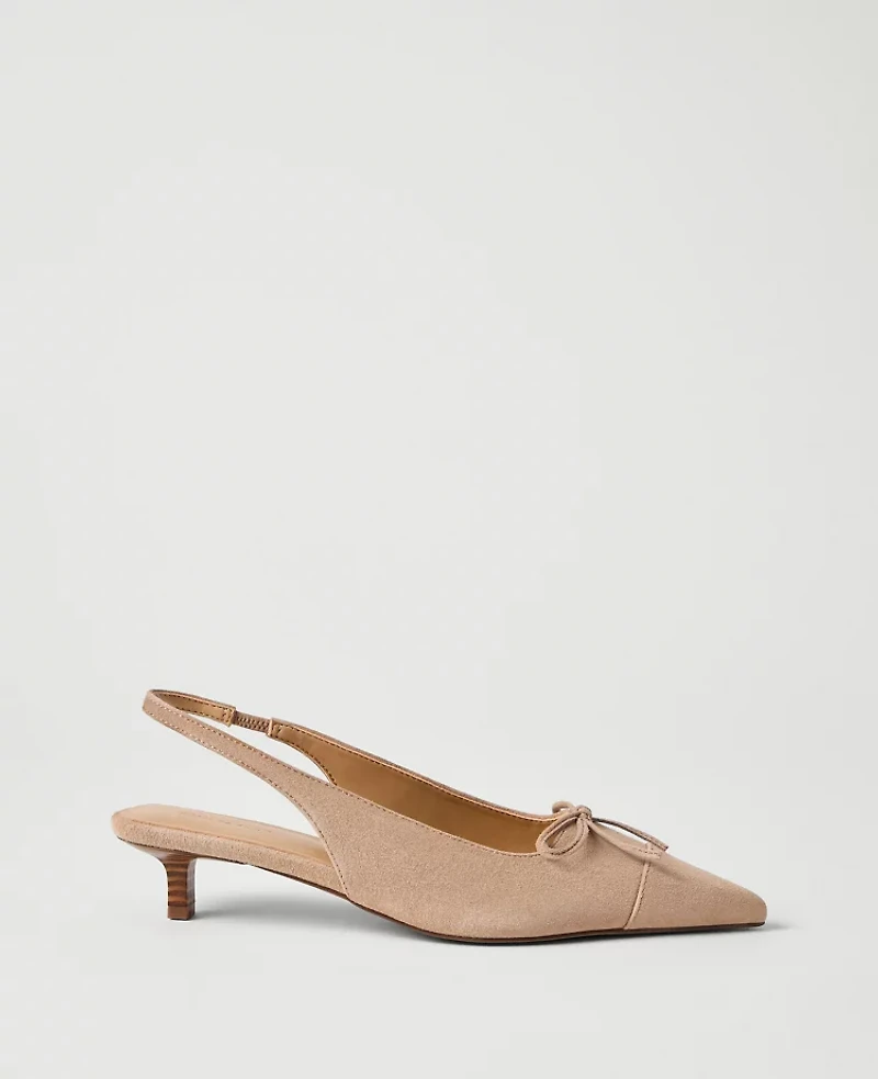 Sleek and minimal, these slingback pumps are topped with a chic bow for a sweet, feminine finish. Pointy toe Padded footbed for complete comfort. 1/2 heel., Imported:, Fabrication: 100% LEATHER, Garment Care: N / A Suede Bow Kitten Heel Pump by Ann Taylor Size Classic - 5 Dominican Sand Women's Low, Pumps Footwear 100% LEATHER N / A