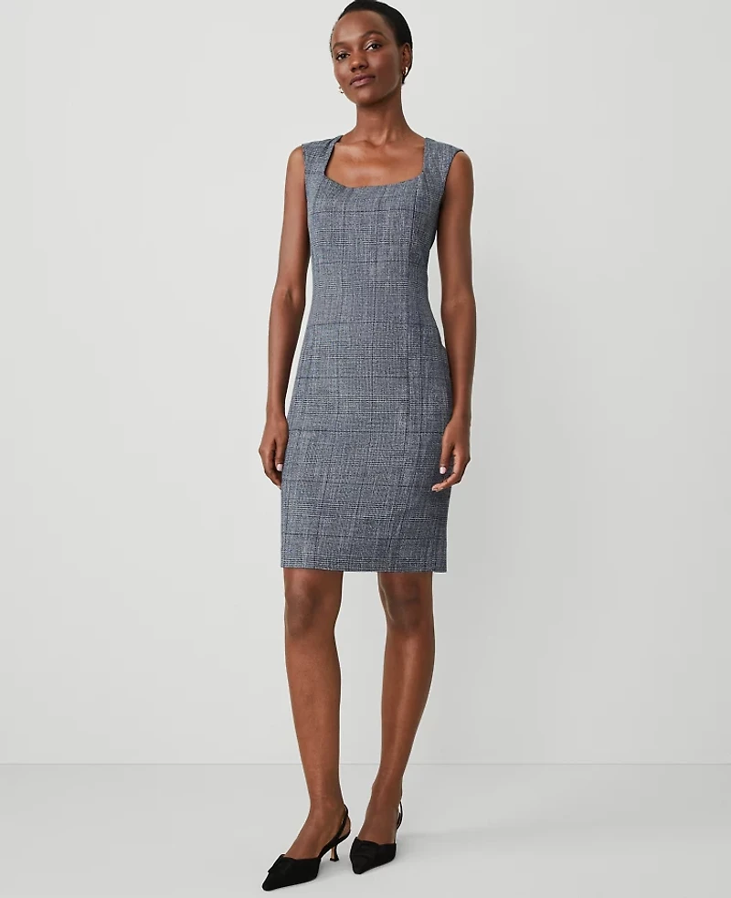 Ann Taylor The Square Neck Sheath Dress Plaid Navy/White Combo Women's
