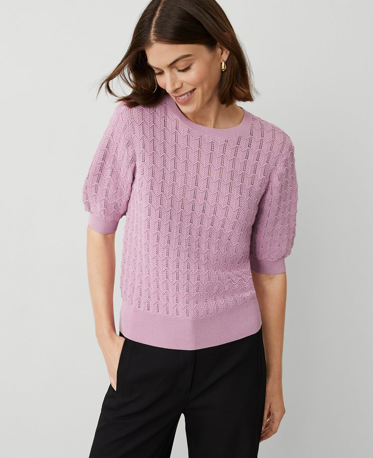 A wavy stitched pattern treats this flattering wedge knit to modern appeal. Ribbed round neck, cuffs and hem. Short blouson sleeves., Imported:, Fit: Softly fitted, Length: 21 1/2 long, Fabrication: 60% Polyester, 40% Viscose, Garment Care: Machine Washable Wavy Stitch Wedge Sweater by Ann Taylor Size Classic - XS Dusted Orchid Women's Crew, Neck Short Sleeve Pullover Sweaters 60% Polyester 40% Viscose Machine Washable Best Fall Sweaters