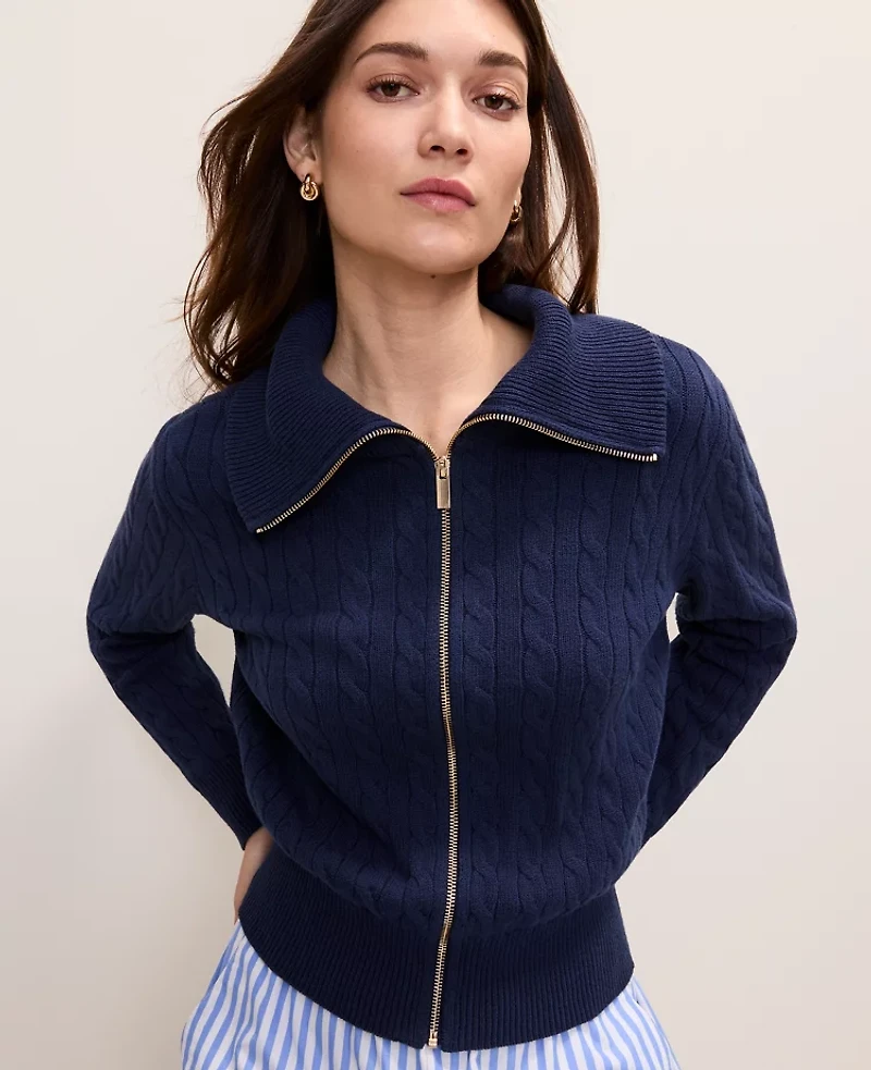 Discover Ann Taylor Weekend. Stay cozy and stylish in this chic cable knit sweater jacket. Ribbed stand collar, cuffs and hem. Front zip closure. Long raglan sleeves., Bullet1: For heights 5'4"and below, try our petite fit., Imported:, Fit: Relaxed fit, Length: 21 1/2"long, Fabrication: 96% Cotton 4 Other Fiber, Garment Care: Machine Washable Weekend Cable Sweater Jacket by Ann Taylor Size Classic - 2XS Pure Sapphire Women's Cotton, Blend V - Neck, Long Sleeve Cardigan Sweaters 96% Cotton 4% Other Fiber Machine Washable Best Fall Sweaters