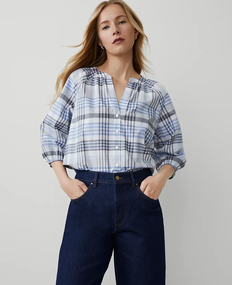 Discover Ann Taylor Weekend. Effortlessly polished pieces for wherever your plans take you. This fluid top flows with artful shirring from its neckline to feminine blouson sleeves. Split neck with tab collar. Front button closures. 3/4 sleeves with elasticized. Hi - low shirttail hem., Imported:, Length: 26 long, Fabrication: 100% Cotton, Garment Care: Machine Washable Weekend Collection Shirred Popover by Ann Taylor Size Classic - Medium Night Sky Women's 100%, Cotton Split Neck Long Sleeve Popover Tops 100% Cotton Machine Washable