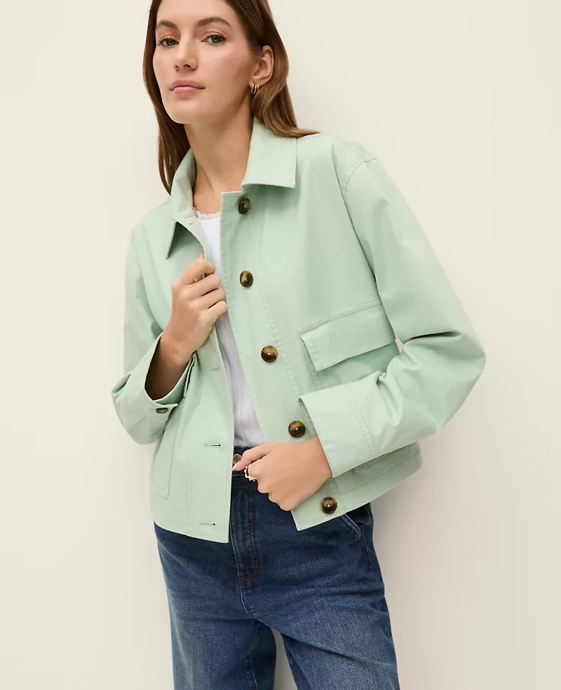 Discover the Weekend Collection. The perfect structured yet relaxed silhouette, this shirt jacket pulls together laid - back looks. Point collar Front button closures. Drop shoulders Long sleeves with button cuffs. Front flap patch pockets., Hit: Hits at hip, Imported:, Fit: Straight fit, Length: 21"long, Fabrication: Shell Cotton 97%, Spandex 3%; Lining: Polyester80% Cotton20, Garment Care: Machine Washable Weekend Collection Shirt Jacket by Ann Taylor Size Classic - XS Aqua Foam Women's Cotton, Blend Jackets Long Sleeve Jackets Shell Cotton 97% Spandex 3% Lining, Polyester80% Cotton20 Machine Washable