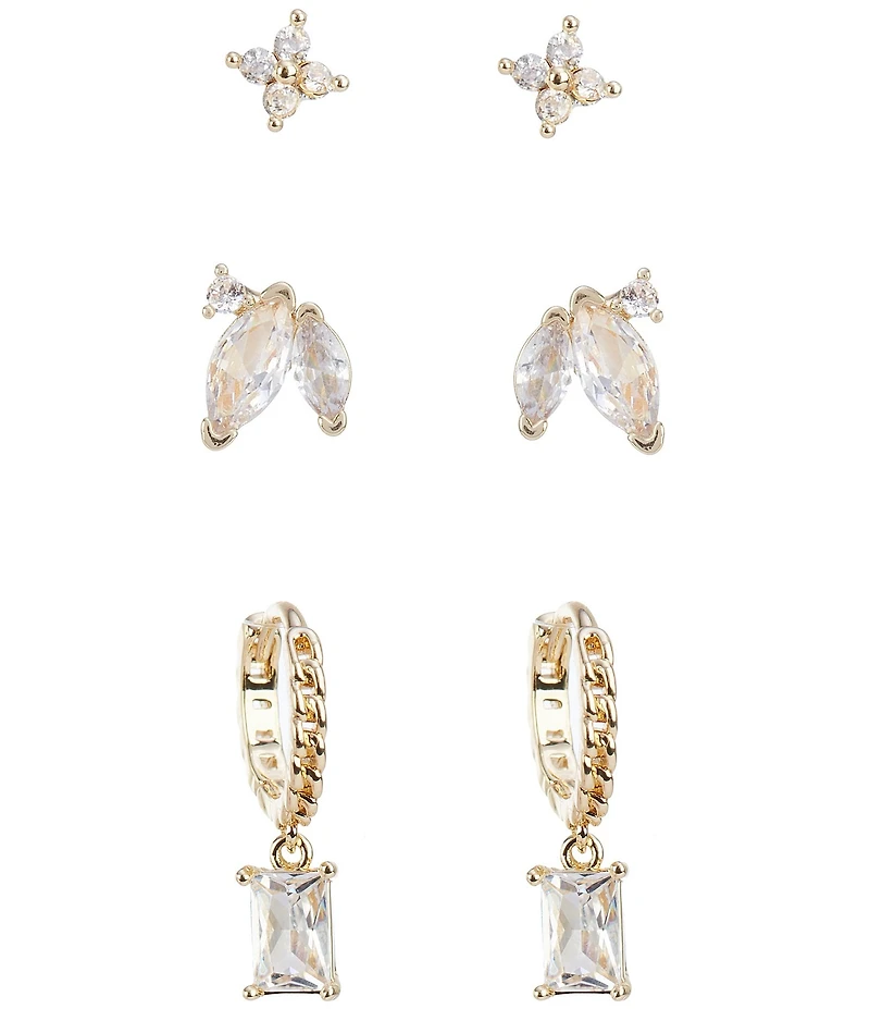 From Anna & Ava, this earring set feature: Waterproof 18k gold plated brass with cubic zirconia stones Post / click top closure Stud 1 approx. 0.25" L x 0.25" W Stud 2 approx. 0.5" L x 0.5" W Hoops approx. 0.75" L x 0.5" W Imported.
