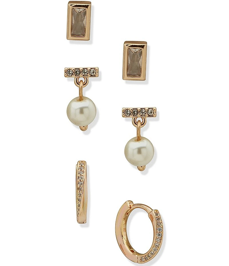 Anne Klein Gold Tone Pearl Baguette Stone Trio Earring Set