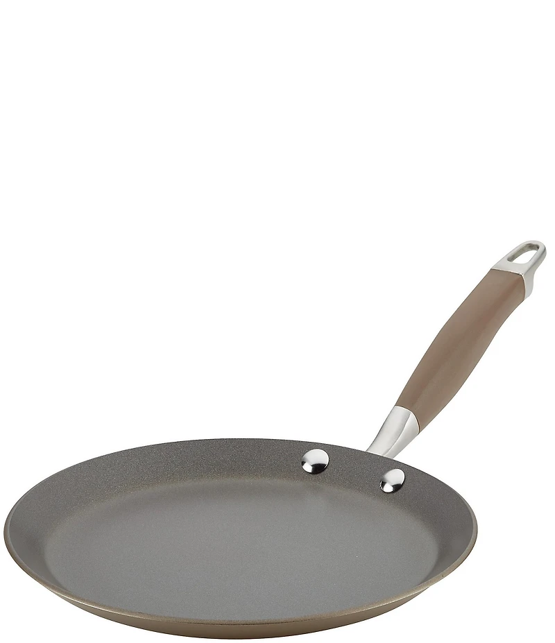 From Anolon Advanced Home Cookware, this 9.5" Crepe Pan features: Aspiring home crepery chefs, your next step to sublime cooking starts here Anolon Advanced Home provides dependability and versatility with one of the very best nonsticks on the market in this crafted kitchen essential designed to outperform, outlast, and outshine your current cookware or crepe pan Engineered for fast, uniform heating, this hard-anodized crepe pan is twice as hard as stainless steel for durability that lasts Designed with a low pan profile, crepe pans make it easy to flip and turn thin, golden brown crepes, pancakes, and other delicate recipes Oven safe to 400°F, this small griddle pan features Infinity Slide technology for one of the longest lasting and smoothest-gliding cookware surfaces you can buy If you expect more from your nonstick, welcome to the sublime cooking experience of Anolon Advanced Home Also Features: Hard anodized aluminum Durable nonstick exterior finish Dual riveted silicone with stainless steel handles Infinite slide nonstick Compatible with any stovetop Not suitable for induction Hand wash Measures 9.5" Imported. Product Disclosure